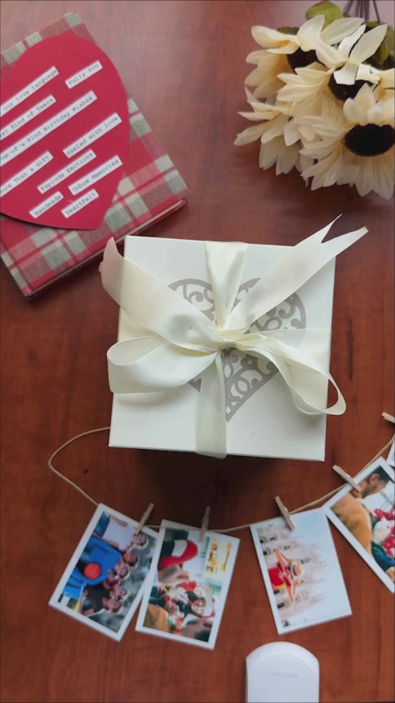 Take pride in presenting a gift that's uniquely yours. Take pride in presenting a gift that's uniquely yours: three message cards 💌, a secret message pocket 🤫, four pull-out photo albums 📸, and four sets of wallet-size photos 🖼️.